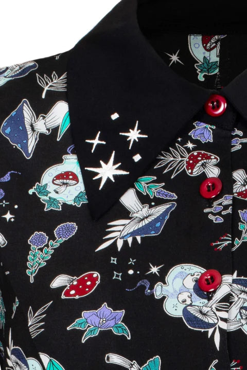 Step into enchantment with the Hell Bunny Amanita Mini Dress in size large. This playful dress features a black pointed collar adorned with delicate white sparkle embroidery that adds a magical touch. The black fabric is decorated with whimsical witchy mushrooms and woodland motifs, perfect for those who love a little dark charm. The fitted bodice flares into a fun skirt from the waist, complemented by short puff sleeves with comfy elasticated cuffs. With a bold red button fastening that unbuttons partway down the bodice, this dress brings a flirty, mystical vibe to your wardrobe.