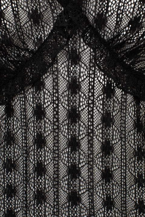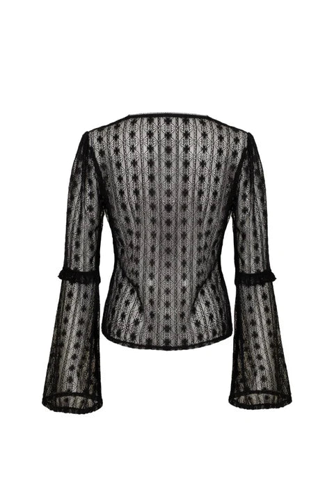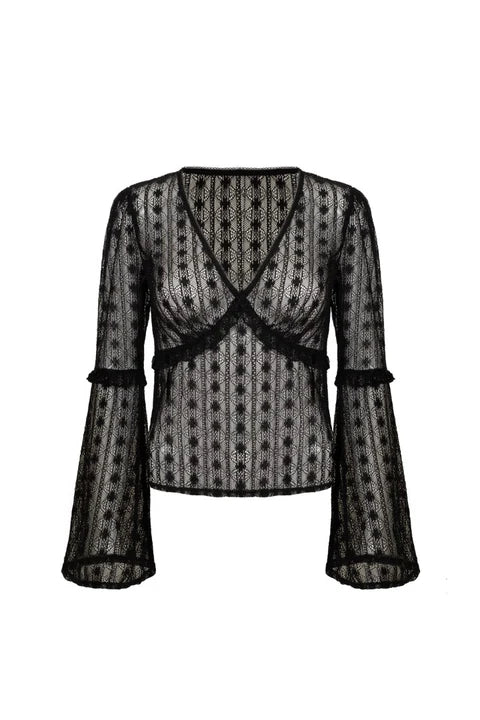 Step into your witchy best with the Hell Bunny Rhianne Top! This black lace stunner features a flirty V-neckline gathered under the bust to highlight your curves. The full-length sleeves flair from the elbow, finished with a delicate frill trim for that perfect touch of vampy charm. Ending right at the hip, it tucks easily into your favourite jeans or skirt, making every outfit enchantingly effortless.
