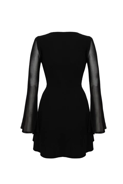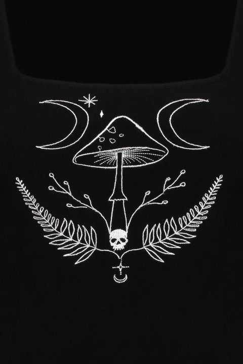 Embrace your mystical side with the Hell Bunny Russula Dress. This enchanting mini dress features a striking black base adorned with whimsical white embroidery of mushrooms and moons. A square neckline and princess seams create a flattering silhouette, while the flared black mesh sleeves add a touch of magic. Perfect for turning heads and embracing the mysterious, this dress is a playful addition to any wardrobe craving a bit of dark charm.